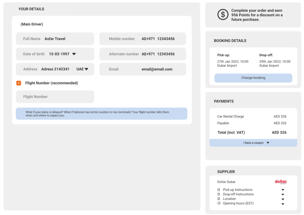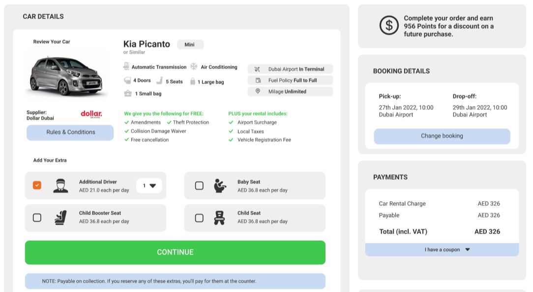 Check and confirm your Car details, read Rules & Conditions, and additionally select optional services from “Add Your Extra” section (ex. Luggage Rack, GPS, Baby Seat, Child Seat, etc.) and you can as well add car protection to complete your peace-of-mind state and then click on “Continue” tab to enter information of “Main Driver” with correct name, date of birth, contact details (mobile no. and e-mail), address, and flight number (your flight number tells them when and where to expect you) and then click on “Continue to Pay” tab. Note: Bookings will fail if you have entered incorrect details.