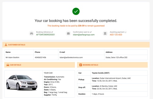 A confirmation page will appear to confirm that your booking was successful. You will receive a confirmation e-mail once your payment is verified, which contains all details for your car rental and important information.