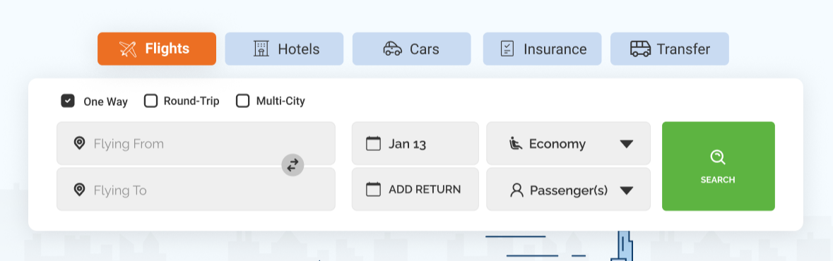 Click on “Flights” tab. Key in “Flying from” and “Flying to.” You will be supported by a drop-down list. Mouse over the list and select. Enter your travel dates and select your class and number of passengers and then click on "Search Flights."