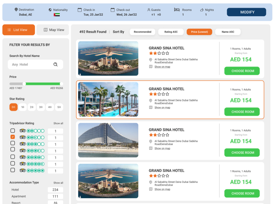 Wait for search results to load. Compare available Hotels getting your results sorted by “Highest or Lowest Price First,” “Name,” or “Rating.” On the left row, you can feature the range of “Price.” You can also specify the “Stars Rating,” the “Zone” surrounding the destination, the “Hotel Theme,” the “Board” type, and the “Accommodation Type,” along with the “Amenities” offered. Or click on "Modify" to continue searching with different options.