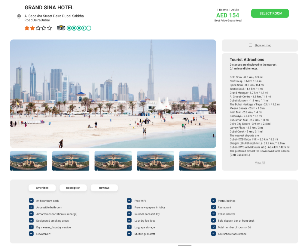 Check and review your selected hotel details (location, amenities, and descriptions) and available rooms and room details. Click on "Book Now" for the room which you would like to book.