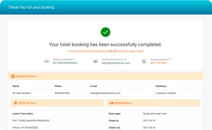 A confirmation page will appear to confirm that your booking was successful. You will also receive a confirmation e-mail once your payment is verified, which contains all of your hotel details and important information.